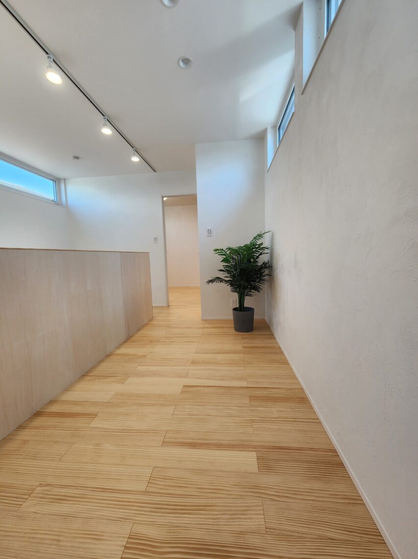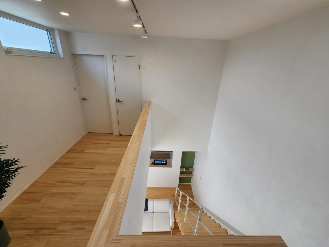 2階へ上がると、階段・吹抜・2階のフリースペースが横並びとなっております。