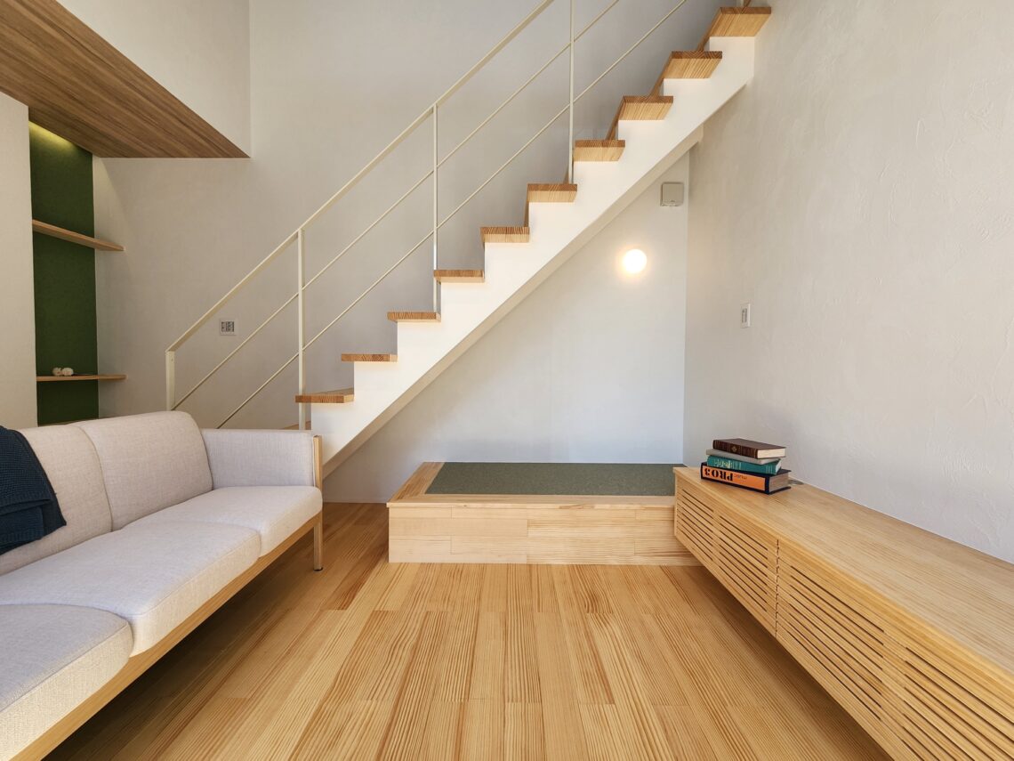 リビングのオープン階段の下には、閉鎖感の少ない畳ヌックがあります。