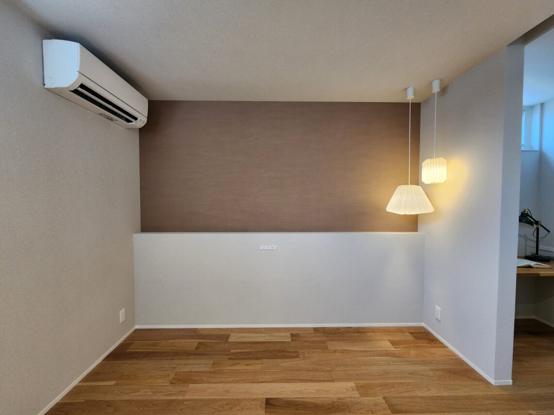 寝室にも和のテイストのペンダントライトを設置。