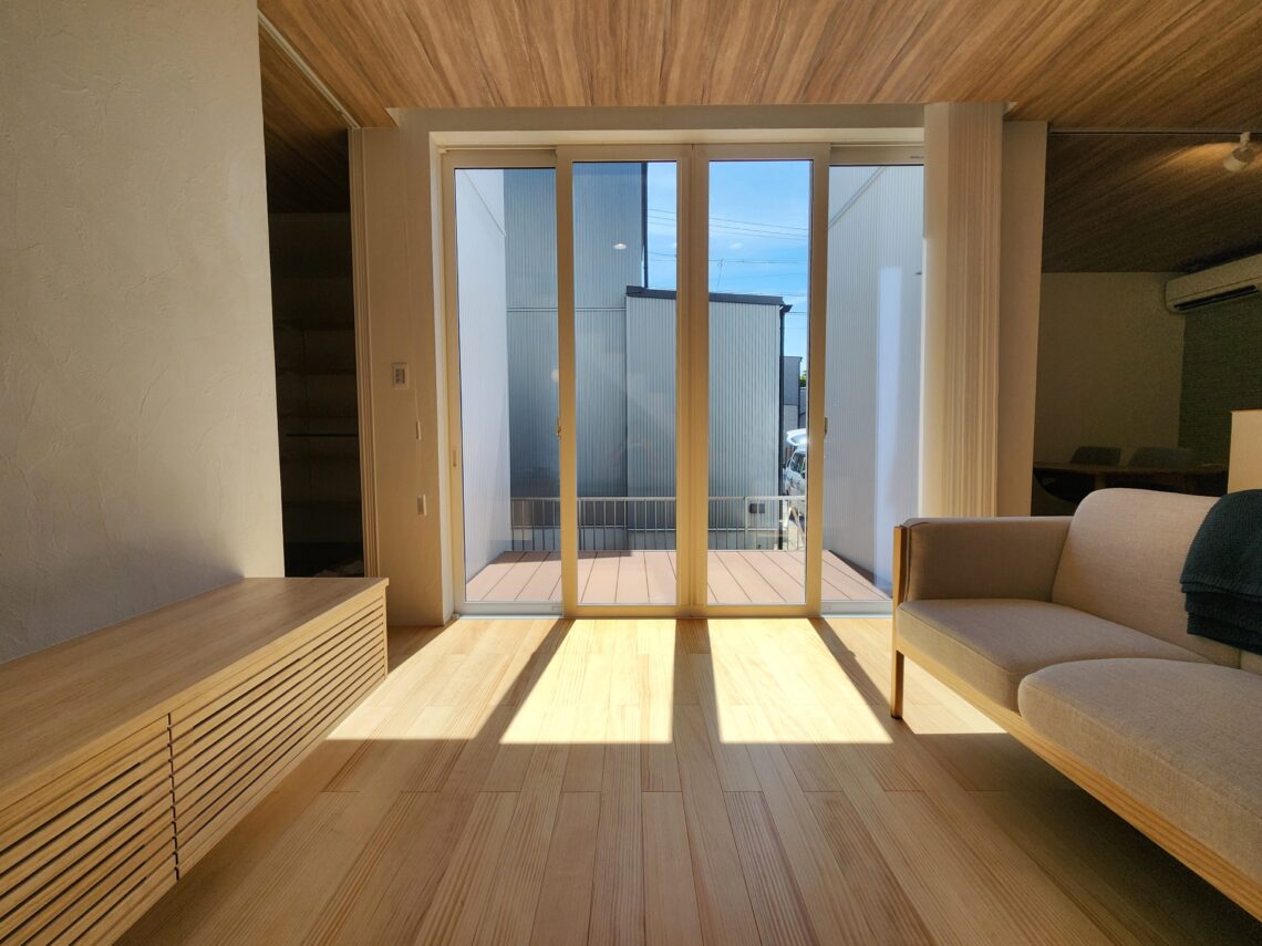 リビングの大きな窓の前にはウッドデッキの中庭があります。