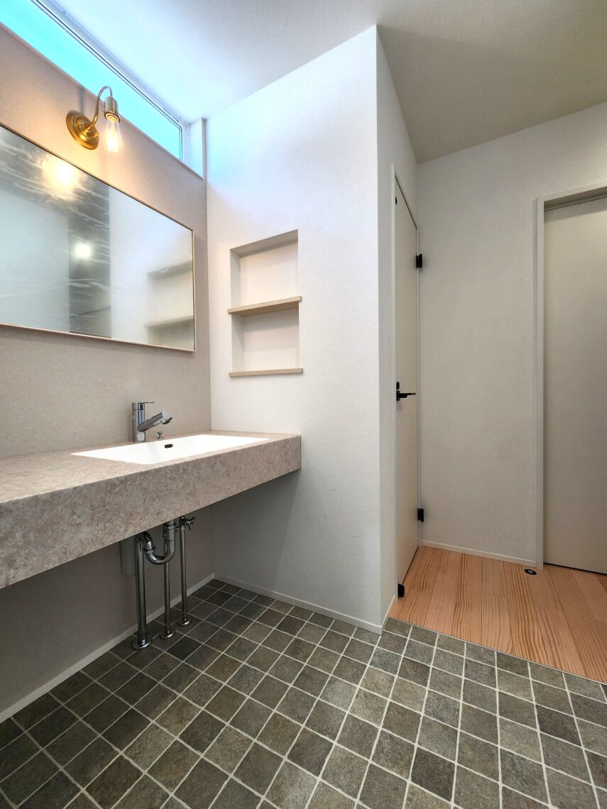 水回りのクッションフロアをアクセントとして引き立ててくれる印象です。