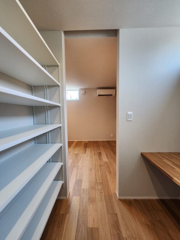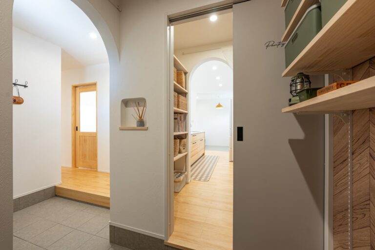 玄関からそのままパントリーへ、さらにキッチンへとつながる快適な帰宅動線を採用。